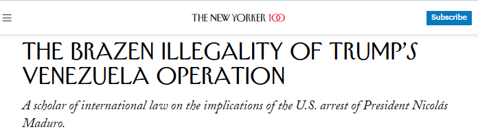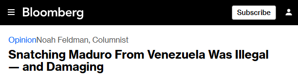 哈佛大学法学教授诺亚·费尔德曼(Noah Feldman)在彭博社网站宣布谈论指出,美国此次军事举动,不只违背国际法,亦违背美国国内法令结构。此次举动及美方揭露表明将“接收”委内瑞拉并操控其石油资源的言辞,均构成对国家主权与自主管理这一国际法底子准则的揭露应战。