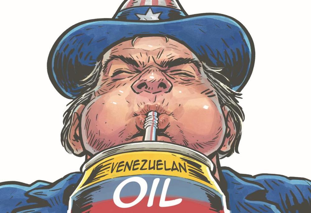 石油是美国对委内瑞拉打开军事举动的理由之一。(漫画作者:中国日报 蔡朦)