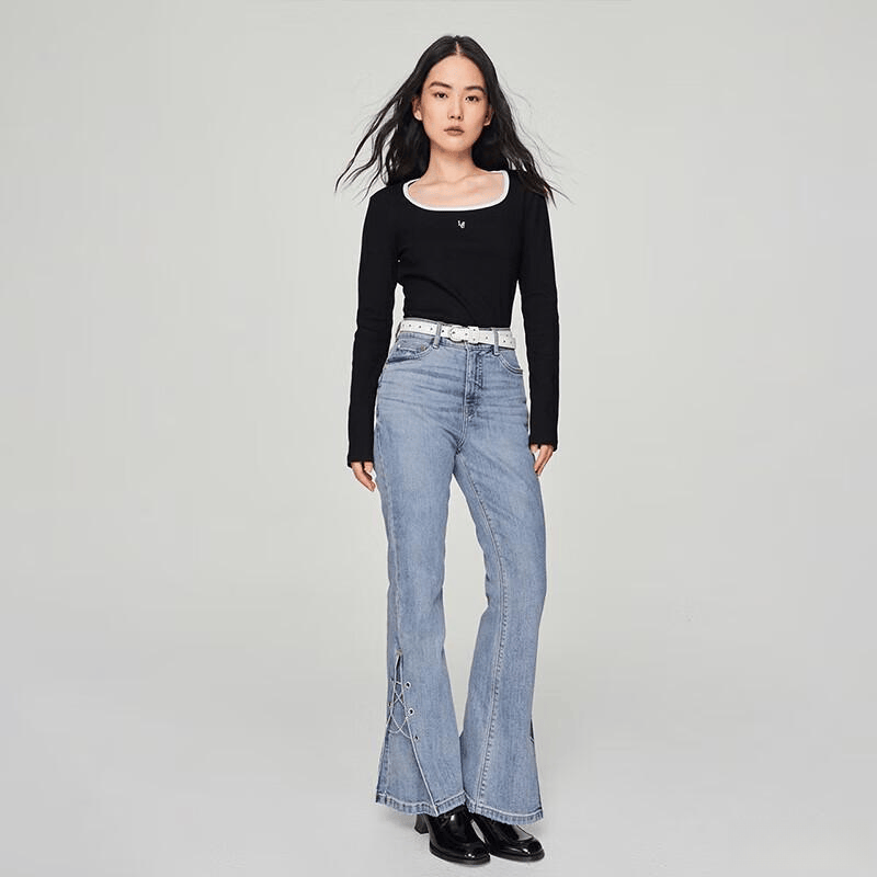 这款牛仔裤展示出极强的百搭特点,能轻松融入多种穿搭场景。调配修身黑色上衣与高跟鞋,瞬间提高气场,合适通勤或约会场合。换上宽松针织衫与平底鞋,则出现休闲随性的日常风格。白色腰带的参加可杰出腰线,增强造型层次感。系带装修为全体增加规划感,让根底调配不再单调。无论是正式仍是放松时刻,它都能成为造型的安稳支柱,真实的完结一裤多穿。